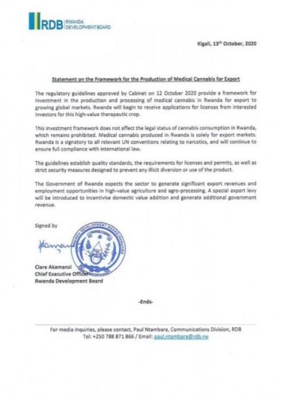 U Rwanda rubaye igihugu gishya muri ibi bice bya Africa, nyuma y’Africa y’epfo, Malawi, Zambia, Zimbabwe na Lesotho byemera guhinga no kugurisha urumogi ku mpamvu z’ubuvuzi.